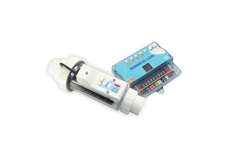 O Gerador de Cloro Brustec, consiste em um equipamento eletrônico que através do processo de eletrolise em água com sal, quebrando as partículas de sal (NaCl) e água (H2O) e gerando o Hipoclorito de Sódio (NaClO), em dosagem continua enquanto a bomba estiver em funcionamento.